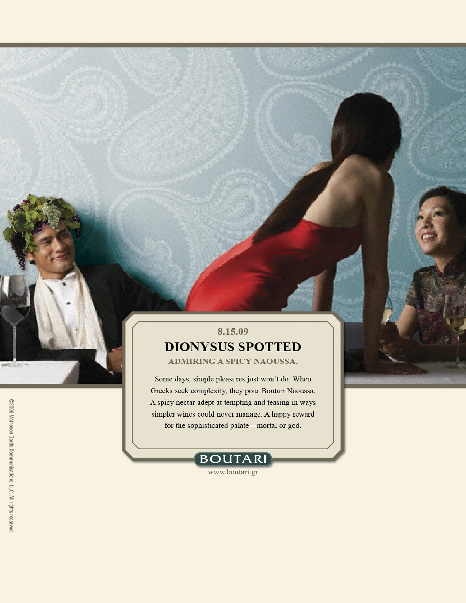 How do you inspire trial of a wine nobody has heard of? You enlist the help of the wine god, of course, and let him deputize fellow Boutari drinkers to carry on in his stead.